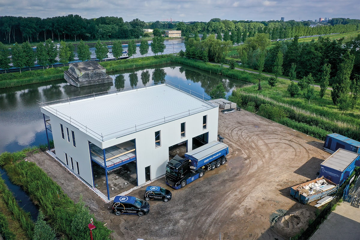 We zitten met Bart Pauw en collega Jelmer Renes in een bouwkeet op hun nieuwe bedrijfsterrein aan het 4e Regimentsdok in Nieuwegein, pal aan het water. Het skelet van het pand staat en binnenkort wordt de vloer gestort. De twee hopen dat alles medio oktober operationeel is en de medewerkers vanuit deze moderne locatie hun werk kunnen doen. De nieuwe vestiging sluit sowieso goed aan bij het werk dat Pauw Dodewaard al in Nieuwegein en omstreken uitvoert. ‘We werken veel voor gemeentes, zoals de gemeente Nieuwegein, Utrecht, Houten en Bunnik en hebben ook andere klanten in deze omgeving’ aldus Bart. ‘Daarnaast willen we de reistijd voor onze steeds groter wordende groep werknemers uit deze regio verkorten. We hadden al wel een kleiner pand in Nieuwegein, maar daar konden we niet meer mee uit de voeten. Toen deze grond te koop kwam was dat een mooie kans. Deze stap is in het belang van onze werknemers, klanten en het milieu. We willen echt een aannemer uit de regio zijn.’