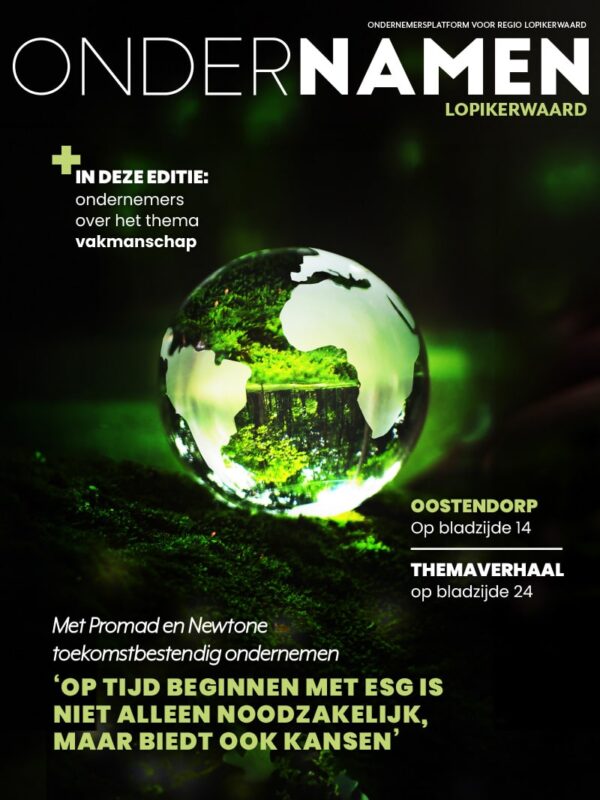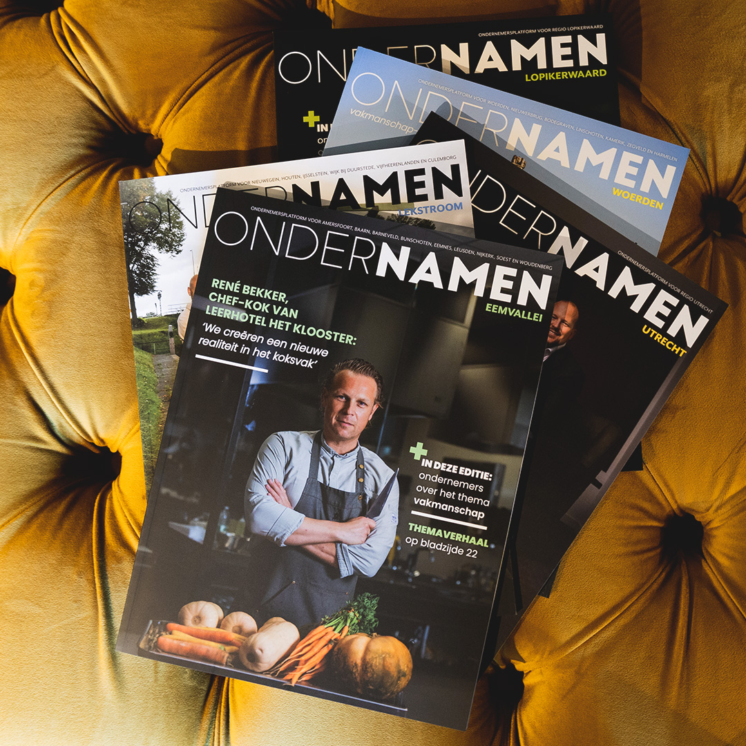 De voorpagina van OnderNamen is natuurlijk de beste plek om te adverteren. Wie voor de cover kiest, kiest ervoor om zijn of haar bedrijf een kwartaal lang op de best mogelijke manier te tonen aan de regio. Inclusief prachtige foto’s, een verhaal van vier pagina’s én een toffe behind the scenes-video. Iets voor jou of jouw bedrijf?